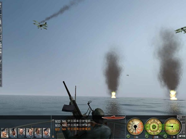 在屏幕的左下角是军官面板,可通过它与船员中最重要的成员进行联系,从左至右分别是:轮机长、领航员、武器指挥官、声纳操作员、无线电报务员、警戒指挥官。