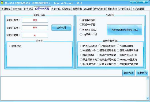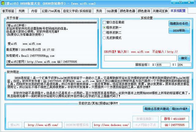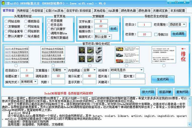 本软件功能不是很强大,但是多少还是有点一点用的,至少对我而言是有用的,此软件基本上把原始DEDE模板上所有的标签都汇集了,而且陆续完善中…到时候你仿站就可以拥有此软件自然得心应手的只在上面盖代码了!