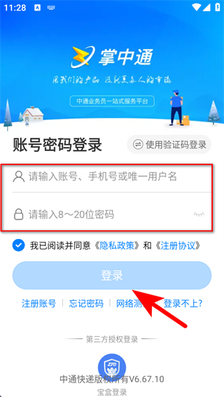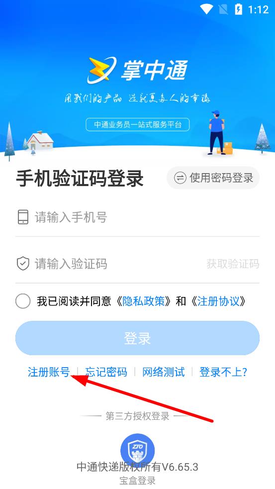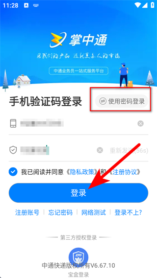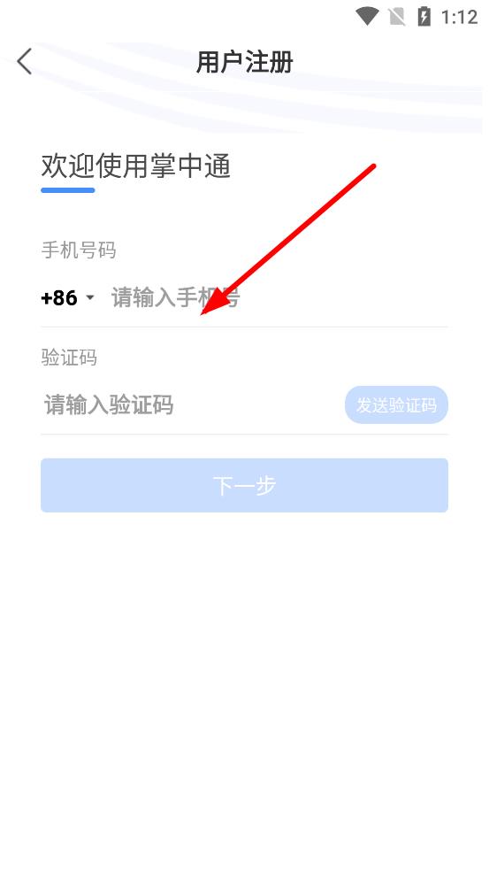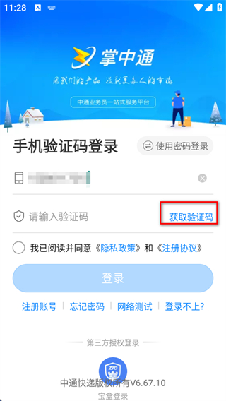 1、打开掌中通APP,进入手机验证码登录界面,输入手机号,点击获取验证码。