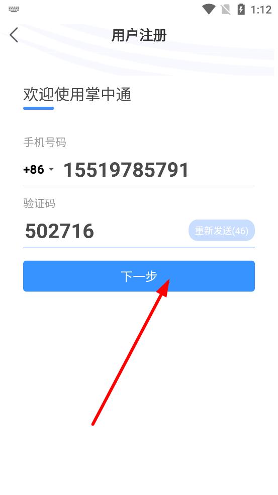 3、确认手机号和验证码填写正确,点击下一步,按后续提示设置密码等,完成掌中通账号注册。