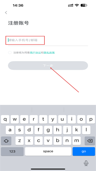 2、在注册账号页面的输入框中,填写要注册的手机号或邮箱,点击下一步。