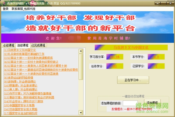 青海公务员学时辅为青海干部网络学院自动学习挂机辅助软件。全自动学习:包含自动选课,学完自动换课程等。只需一次选好要学习的课程,从此实现全自动。使用本软件可在青海干部网络学院网远程学习时自动换课程学习。若使用IE浏览器在青海干部网络学院网正常学习时课程繁多要常手工换课且时不时要回答问题之后才能继续,否则会不计时。若使用本挂机软件远程学习则软件会自动换课程学习直至你选的课程全学习完。