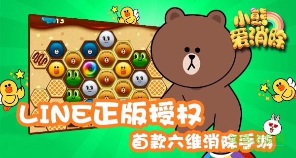 《小熊爱消除》是由龙图发行的全球首款六边形消除手游。获得LINE正版授权,以LINE经典卡通角色为元素,精心设计45个主题章节、超过500个充满奇趣的关卡。分数关、钥匙关、巧克力关……独特的消除方式与华丽的消除特效,带来妙趣横生的挑战和轻松愉悦的成就感。更可与好友互动、挖掘无限惊喜福利,尽情享受休闲乐趣!