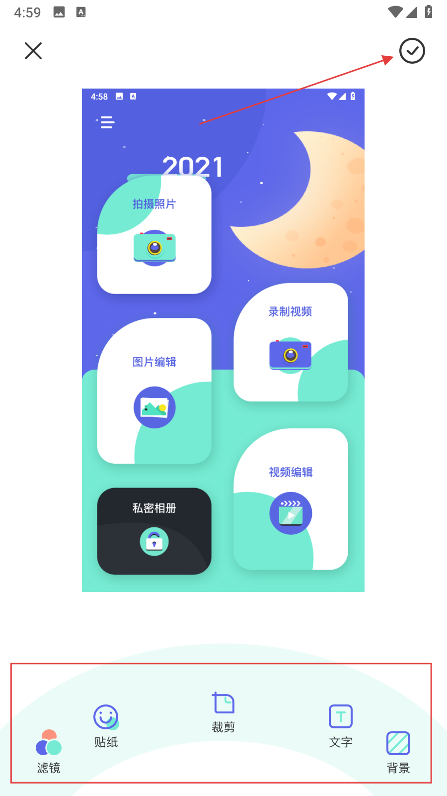 3、按照需求对图片进行编辑,完成所有编辑后,点击界面右上角对勾形状的确认图标即可。