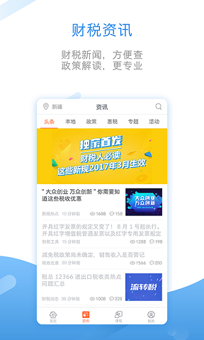财税人的专业服务平台; 财税咨讯:第一时间了解财税新闻与政策解读, 以及更多本地财税资讯,让你随时查看 ,网课面授:多样化的课程及面授报名,面授后可互动交流,及时解答您的疑问,让您及时预约 ,财税疑问:提供最专业、最权威的专家为您答疑,回复高效,解答精准可靠并有可操作性,让您随时提问 ,实用工具:提供个人实用工具及涉税服务工具,让您体验快捷便利