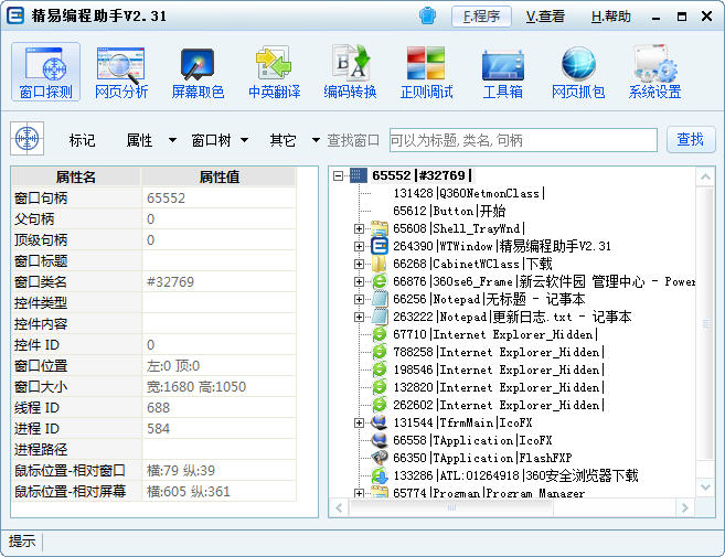 窗口探测 → 清晰的分析窗口中各种控件的ID,句柄,标题,类名,位置,大小!