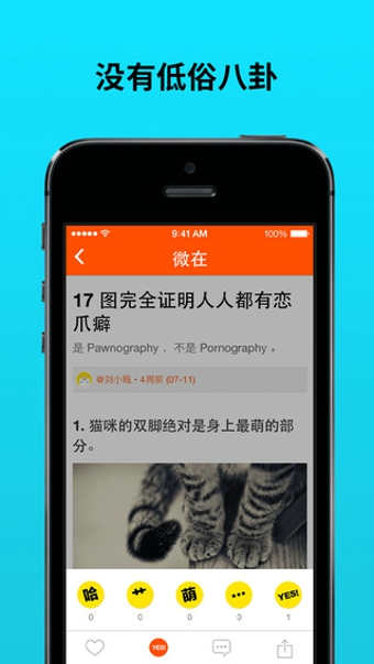 微在微在官方介绍是“反正只有 1% 的人能成为微在的读者。”虽然仍是一款阅读软件,但打开之后你就会发现这里的所有文章都充斥着独特的的个性,没有装B论,没有低俗八卦,没有脑残吐槽,没有成功学,一个让思想自由挥洒的地方。