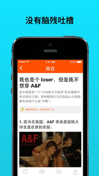 微在(Wezeit.com)是朋友圈里趣味病毒携带者,只传染有另外一种存在方式的地球人。这里没有成功学、装B论、低俗八卦和脑残吐槽。反正只有 1% 的人能成为微在的读者。