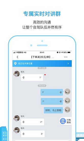 行程队伍拥有专属行程对讲群,解放传统对讲机,队伍将拥有更高效,更及时,更稳定,且不受距离限制的实时对讲服务。