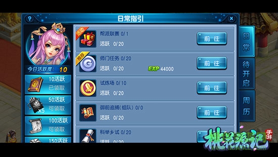 除了主线任务,根据指引完成日常活动也能获得大量经验。单人任务:师门任务,赏金通缉,都是前期主要的经验来源。到达31级后,可以到试炼场一展身手,不论胜败都有丰厚的经验奖励。