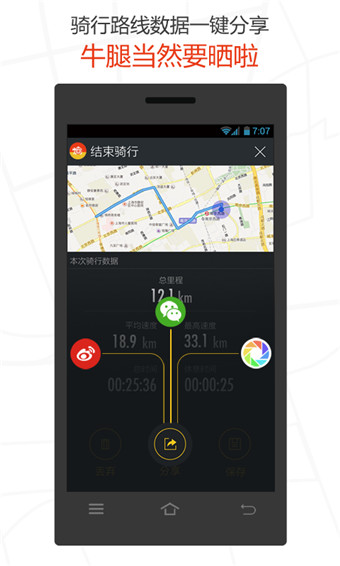 一键分享:一键分享到微博微信朋友圈,号召小伙伴们一起骑车吧。