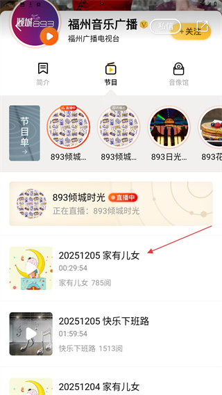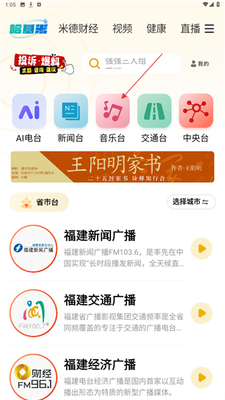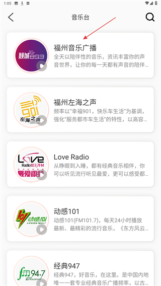 2、进入音乐台的页面内,点击福州音乐广播的按钮。