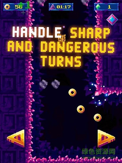 左右移动飞船,尤其要注意转弯,一不小心就会撞到岩壁。