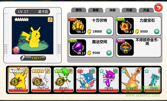 皮卡丘有四大技能,分别是:十万伏特、攻击强化-高、法功强化-高、圣佑。