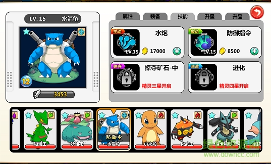 水箭龟的四个技能分别是水炮、防御指令、进化、掠夺矿石。