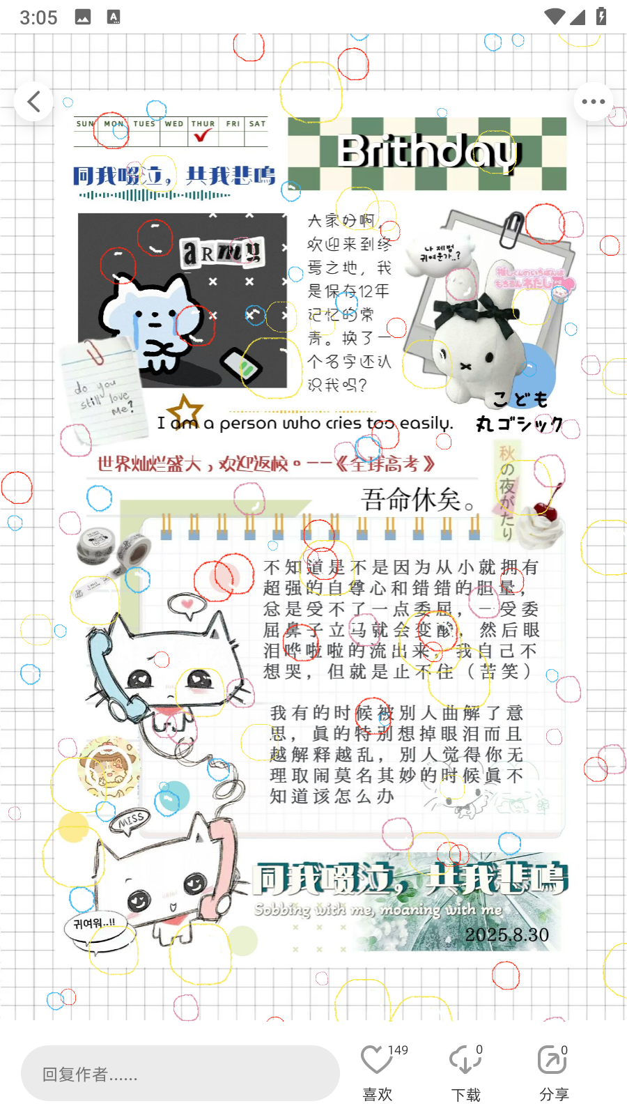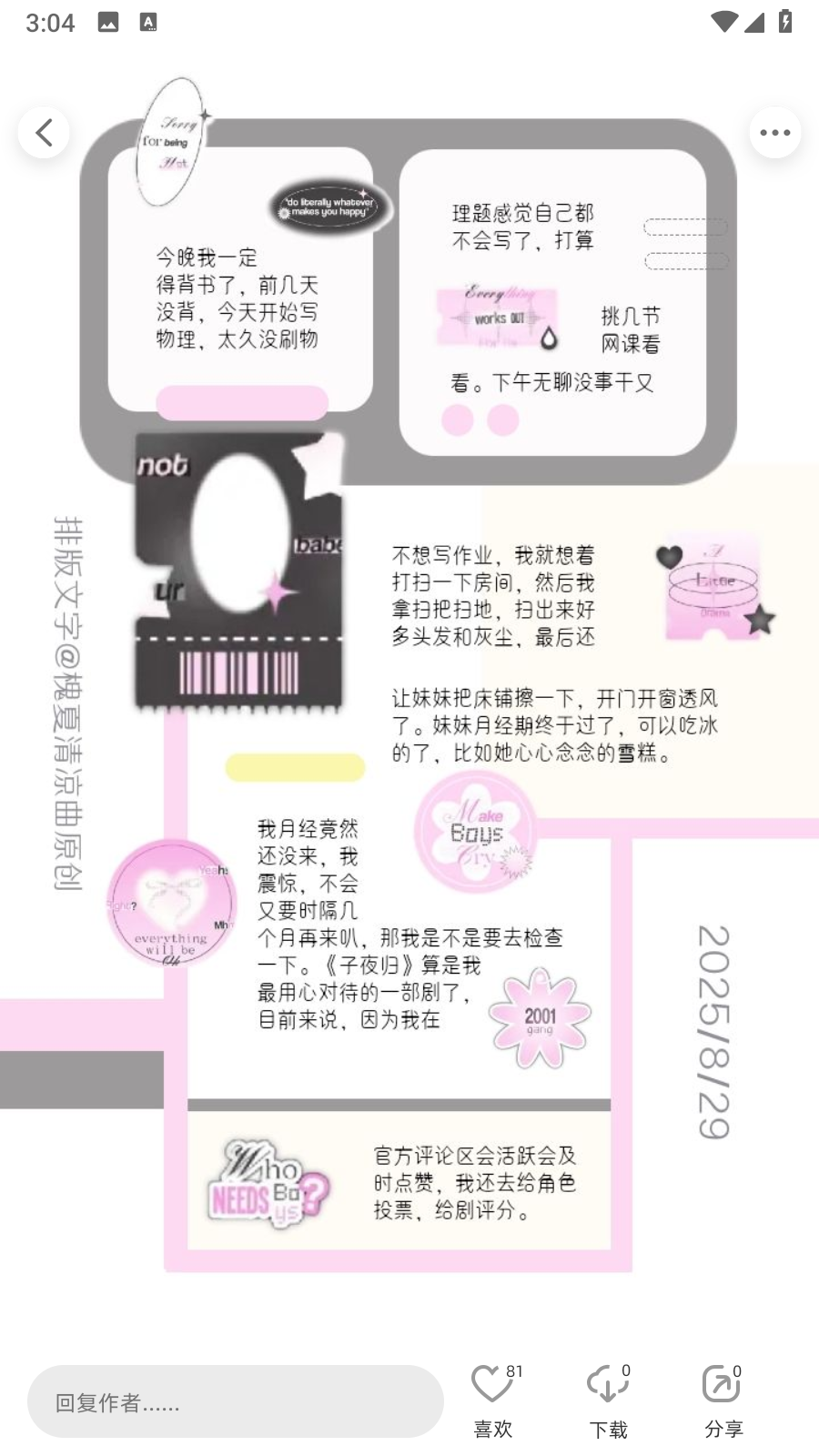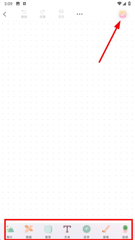 3、在手帐编辑界面底部有丰富的编辑工具,点击相应工具,选择喜欢的素材进行排版拼贴,完成创作后,点击右上角的图标保存手帐。