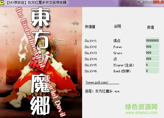 东方红魔乡无敌修改器是一款可以帮玩家将得点修改为无限,生命,炸弹等等都修改为无限的游戏辅助,需要的朋友赶紧来绿色资源网下载吧
