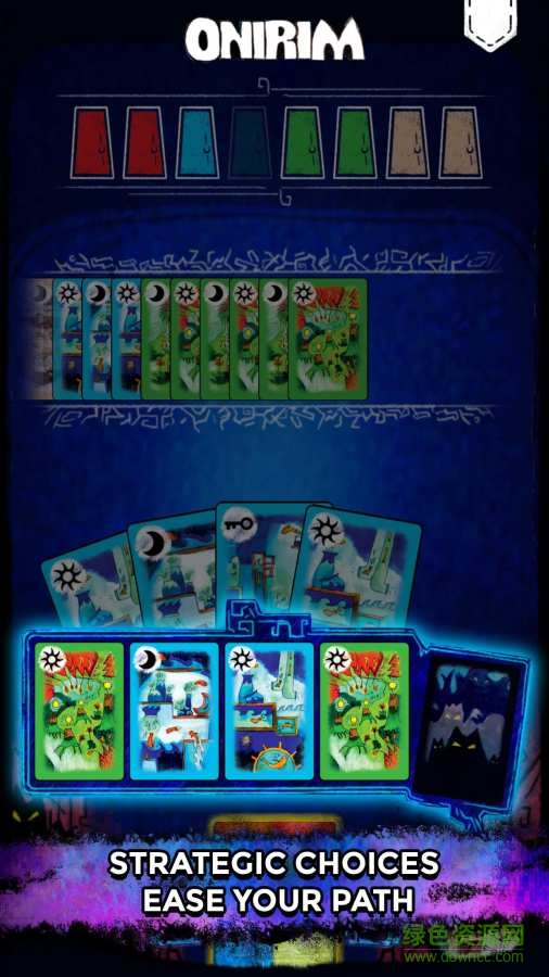 onirim是纸牌接龙游戏。你必须对游戏中收集八个梦的门在甲板上跑出来。你可以通过同样的颜色三张牌连续地或通过丢弃一个强大的钥匙牌来获得门牌。在这两种情况下,你必须决定最好的使用每个卡在你的手,并仔细玩噩梦。那些卡片藏在甲板上,当被拉出来时会引发痛苦的困境。