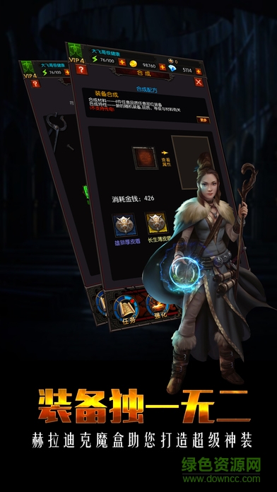 3.神奇装备:锻造后可以变废为宝的白装、充满魔性的蓝装、多条属性的金装和暗金装、更有独创的传奇套装。