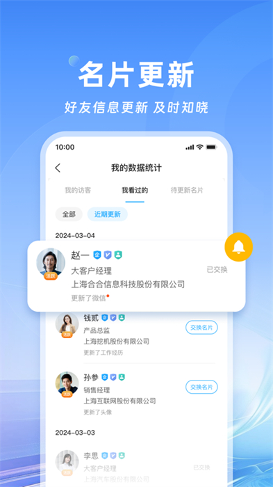 收到客户名片,手机一拍,就能看到对方公司的最近新闻,还能随时更新。客户动态,实时掌握。不论是客户更新了联系方式,还是自己更换了名片,都会第一时间通知相关联系人,让您的商务人脉实时保持新鲜。