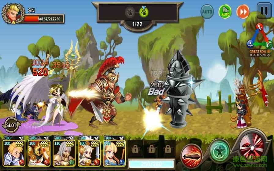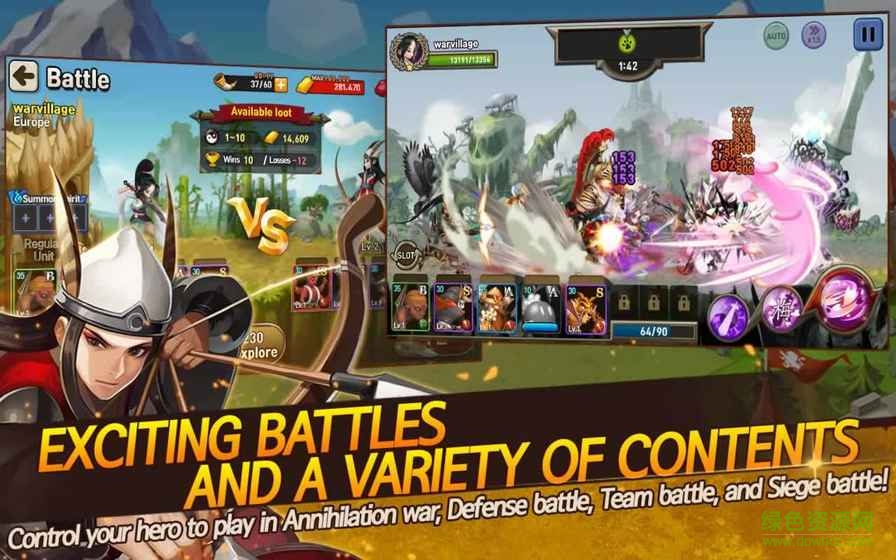 在主打战争策略的游戏中,《战争村庄》无疑是战斗方式非常简单直接的那一类。只要带着自家军队从左到右打到底,消灭掉所有敌军就算获胜。己方士兵用小头像图标显示在画面左下方,当图标下面的能量槽蓄满就可以召唤对应兵力出场作战。士兵有从C到SSS的稀有度之分,此外也有近战、远程(物理系)、魔法三大兵种,属性相克相生。获取稀有士兵可通过金钱抽取、兵种进化来达成,当然要是足够有欧气也可以靠推图掉落。
