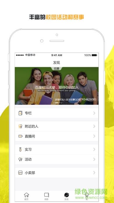 其主要功能包括校园生活(人、事、热点、八卦),校园内容(新闻、资讯),实习,绿色直播,积分活动,