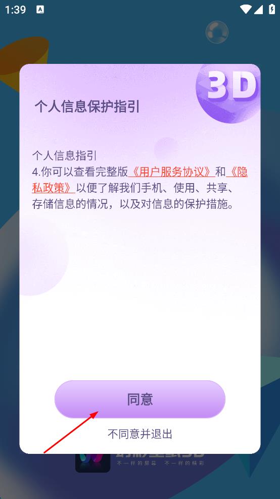 1、打开幻彩壁纸3D应用,弹出个人信息保护指引弹窗,阅读《用户服务协议》《隐私政策》相关内容后,点击“同意”,进入应用 。