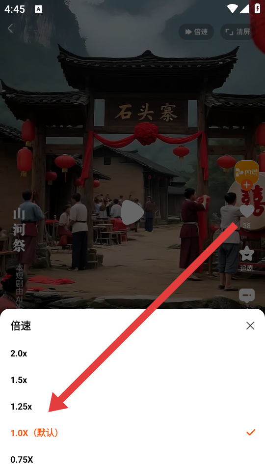4、在倍速选择菜单中,点击想要设置的播放倍速如1.0x、1.25x等,即可完成倍速播放设置。