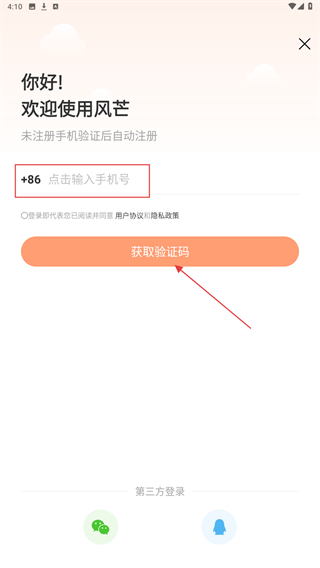 3、进入登录的页面内,输入手机号并点击获取验证码。