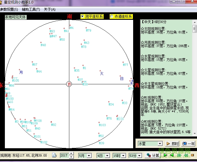 这个软件是我用Delphi6.0开发的,爱好天文的朋友都会碰到一个问题:现在天空有什么星体可观测呢?当然可查阅天文年历,不过挺麻烦的,且不够直观。因此我就做了这个软件,希望对广大爱好者有所帮助。