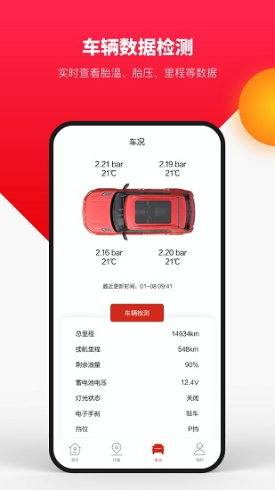 3、轮温、胎压等都能实时检测并同步,让用户便捷了解车辆的使用情况。