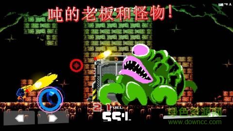 游戏的操作比较特殊,我们按住屏幕左下角的两个按钮可以控制主角左右走位,右下角则有一根横杆,上面也有一个按钮,通过按住它左右拖动来控制瞄准攻击的方向。可以180°射击怪物。