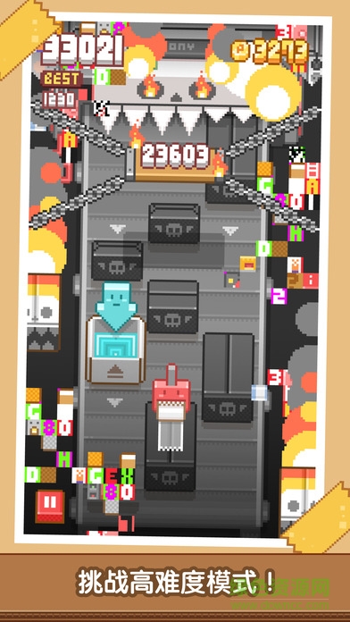 除了封箱这样基础的玩法以外,游戏场景中还有着拥有特殊功能的箱子,比如问号箱子,会在金币、得分、加速字母甚至广告之间随机给予。而白色箱子将会赋予玩家跳关能力,当然了,也是需要付一点点小钱钱的。还有骷髅箱子,可以让玩家进入到困难模式中,在困难模式中,得分速度和难度都是呈指数的形式向上提升。在困难模式里每呆一秒都能获得大量的得分,而相对应的,也许下一秒就是死亡,所以请大家谨慎的选择要不要继续呆在困难模式。