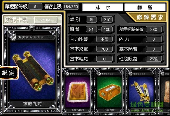 武功在玩家收集以后存放在藏经阁里面,选中以后会放大,点击进入武功界面。