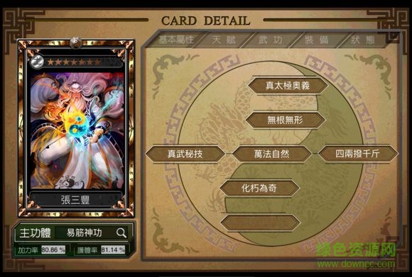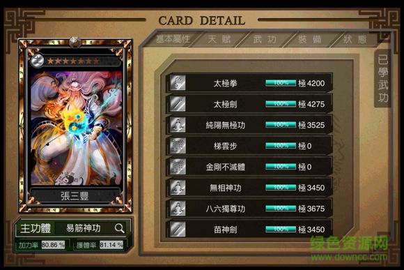 人物准界面介绍了一些生命内力体力值这些传统的东西以外,还介绍了4种兵器值,攻击防御轻功三维属性,资质,筋骨,还有一些连击率互博率的展现。是对传统的金庸群侠的总结和发扬。在主界面任何一个方块都可以进行点击,里面会对任何一项数值进行解释和比较。方便玩家上手。