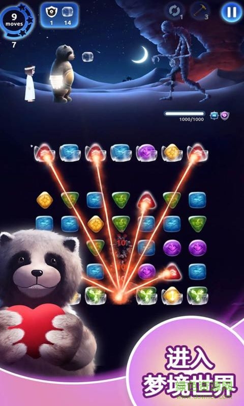 游戏目前共有三个场景共计120个关卡(还在持续更新中),在小熊阿宝的守护下,进入莉亚的梦境,你需要开动脑筋进行组合消除,合理利用道具,甚至有时还要借助一点运气才能完成目标。