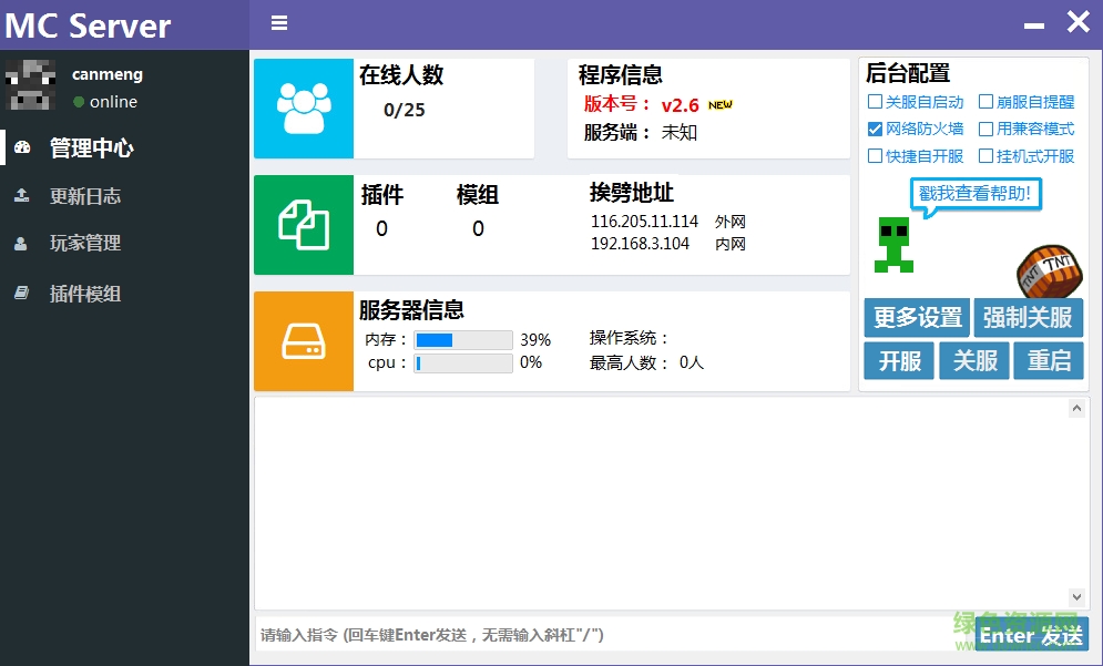 我的世界mcserver开服器,由残梦自主开发,优质界面,参考面板服制作,让你轻轻松松用家机体验开服的乐趣,可视化简便操作,让你轻松管理你的服务器,内置花生壳动态域名解析,让你开服后轻轻松松与互联网中的朋友们联机,自由搜索java,自动优化内存,java内存压缩让你的更快更流畅得开服,内存、cpu、硬盘占用监控让你将整个服务器信息皆收眼底。