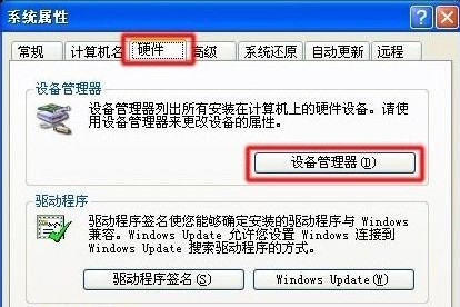 2、在“系统属性”窗口中,点击“硬件”选项卡,然后点击“设备管理器”按钮。