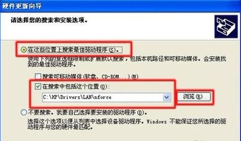 5、在“请选择您的搜索和安装选项”窗口中,选择“在这些位置上搜索最佳驱动程序”,然后选中“在搜索中包括这个位置”复选框,并且点击“浏览”按钮,选择您解压缩后的驱动程序所在的位置,最后点击“下一步”按钮。