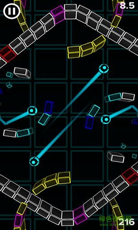 《炫光打砖块 Cancell Ballscape》是一款独特的打砖块休闲游戏,游戏画面简洁采用简洁绚丽的画面。和普通打砖块不同的是本作中小球是在不断跑的,不需要玩家去接。而玩家需要控制周围砖块的转动。让小球不要掉落,游戏需要极高的精准度,你能让小球生存多久而不掉出屏幕?