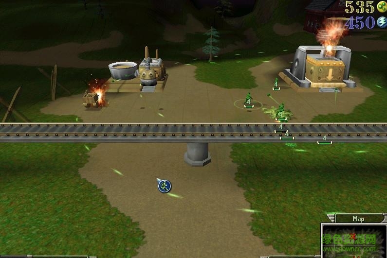 建议玩家在进入游戏前,先进行训练模式,更确切的名称应该是“新兵训练营”。显然游戏面向的并非是有丰富游戏经验的即时战略玩家,而是更喜爱异想天开的低龄玩家,这也是游戏会在PC和PS2平台上同步推出的合理解释。《即时战略版》的游戏界面是标准的即时战略界面,实在是简单得不能再简单了。一辆推土机就能建造任何建筑设施,从总部开始,可以逐步建造资源仓库、兵营、防御塔……只要是接触过《魔兽争霸》或《命令与征服》的玩家,都能够想象这个游戏的所有那些建筑设施。游戏中的资源不是传统的黄金、石油、食品、矿产,而是玩具兵最最需要的塑料和电池能量,而这些资源在人们的日常生活中是随处可见的。因而玩家不必为资源匮乏而烦恼,而且资源的收集是自动的,玩家只要专注于战斗就行了。最有趣的是,牺牲的玩具兵会软化成一堆塑料,同样是可利用的资源,这些塑料被收集起来又能重新生产出新的玩具兵。这种资源循环利用的概念,虽然