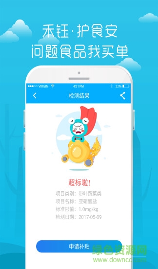 护食安app是一款食品安全检测手机软件,平常的蔬菜、水果、肉类、调味品、菌制品、豆制品、膨化食品等均可进行检测,有详细的检测结果,包括产品的名称、含有的有害物质超标与否等,让您吃的更安心,欢迎大家到绿色资源网下载使用1
