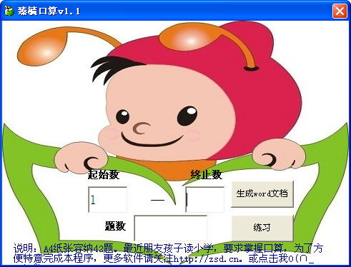 臻毓口算(小朋友算术学习软件)适合于小学小朋友们使用。练习形式生动活泼,内容有加法、减法。适用于学龄前和小学的传统四则运算。软件可自由选择练习,或随机联系。有自设题量、做题时间限制、不同难度等级、错题加罚强化练习等功能。也可由电脑进程式控制来提高练习效率,进行强化练习等。所有功能都可以自定义。练习形式灵活,练习过程中每一小题都采用倒计时、人机对话和生动活泼的音效提示,在轻松而又不乏紧张刺激的环境里提高你的口算速度和心算能力,这将炼就你一生的速算本领,可以生成word文档。预祝你学习成绩进步。