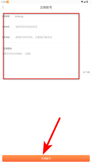 4、在注销账号页面,按要求填写姓名、联系电话、注销理由等相关信息,然后点击注销账号按钮,按提示完成后续操作即可注销账号。