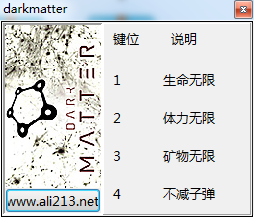 暗物质四项修改器是一款功能强大的游戏修改器,主要针对同名pc游戏玩家打造,通过修改器玩家可以轻松修改游戏中的矿物、子弹、生命等属性,更轻松的进行闯关,欢迎来绿色资源网下载!