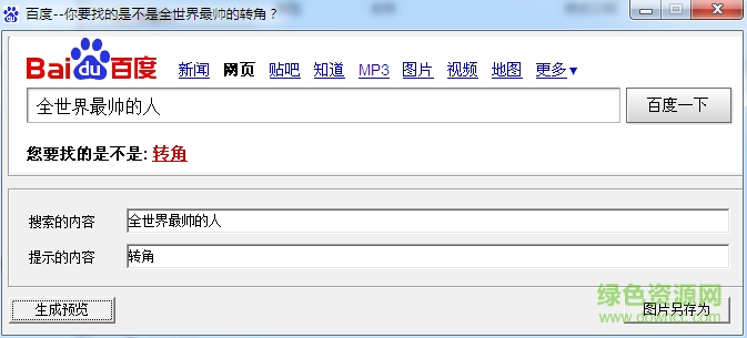 你要找的是不是软件是一款百度图片恶搞生成器,你可以随心所欲的设置各种装B图片,绝对是用来制作个性签名的不二选择,感兴趣的朋友欢迎来绿色资源网下载使用哦!