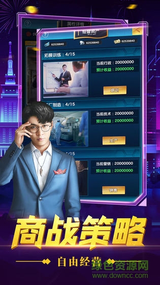 挑战关卡,商业谈判,收购各公司,让各金融巨头每天向你汇报工作和业绩。随着公司规模提升,自动解锁招纳更多的优秀人才前来效力!