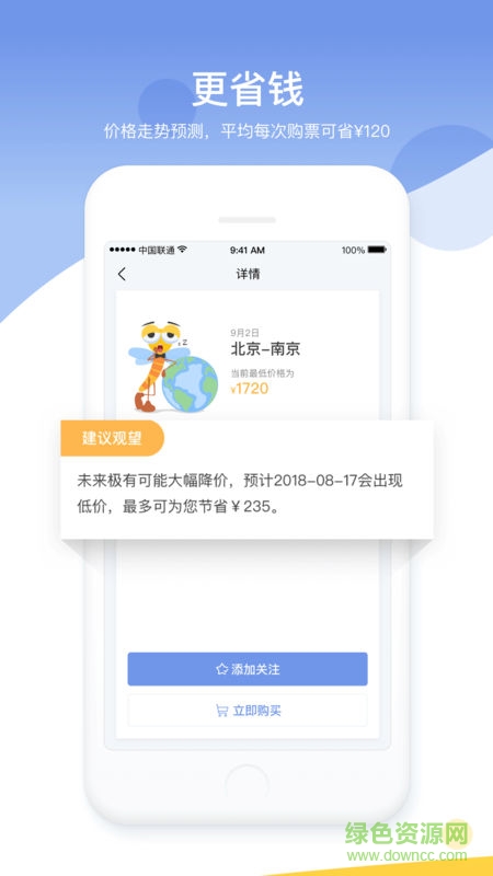 -根据用户搜索的航线日期,给出专业的购买或等待的建议,预测何时买机票最便宜,用户平均每次飞行节省120元