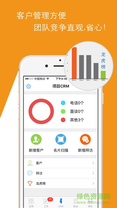 客户资料统一管理,客户拜访实时跟进,扫描自动读取名片,业绩排名一目了然。