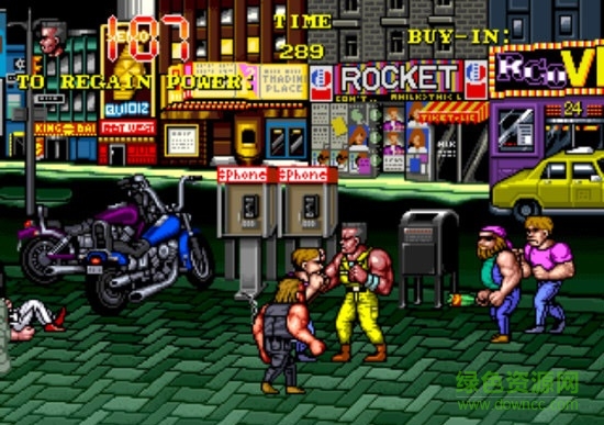 流氓大混战,热血公司的作品,模仿双截龙出品的游戏,感觉超好玩,机厅里我们都叫他“假双截龙”。主角是个标准的壮汉,那些对手都是些流氓杂碎,他的擒拿绝招似乎有n个,个个十分的血腥残忍,可以拿住两个小混混互相对头,还可以追打倒地的混混,比杀就是拽住混混的头发狠命的往地板上磕,十分的暴力,加上场景中很多的摩托车等东西可以举起来砸,游戏显得十分的符合黑社会的性质,棍棒交加,飙车族...应有尽有。